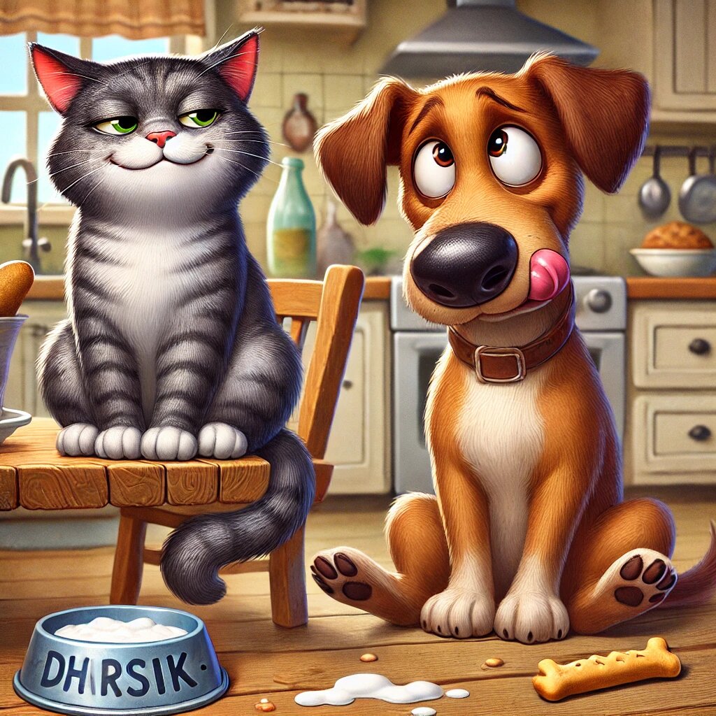 — О, хозяева приготовили для меня завтрак! — довольно мурлыкнул кот и потянулся. Но когда он добрался до кухни, его ждал УЖАСНЫЙ сюрприз! Миска была… ПУСТАЯ! — Куда пропала моя еда?! — воскликнул Барсик. Он внимательно осмотрел кухню. Хлебные крошки вели к двери, а там… на коврике сидел Шарик, довольный и сытый! — Ты… ты съел МОЙ завтрак?! — возмутился кот. Шарик виновато вздохнул. — Ну, я думал, он ничей… Просто лежал на столе… А я не хотел, чтобы он пропал зря… Барсик сузил глаза: — Теперь я устрою тебе урок честности! Кот выждал момент, когда Шарик прилёг вздремнуть, а затем взобрался на стол, где стояла миска с его обедом. Аккуратно, лапкой, он стащил кусочек мяса и… спрятал его! Когда Шарик проснулся, его миска была ПУСТА! — Где мой обед?! — завыл пёс. — Ну, знаешь, он просто лежал, а я не хотел, чтобы он пропал зря… — хитро улыбнулся Барсик. Шарик вздохнул: — Ладно, понял… Давай в следующий раз есть честно. И с тех пор Барсик и Шарик всегда ели вместе, никого не обделяя.