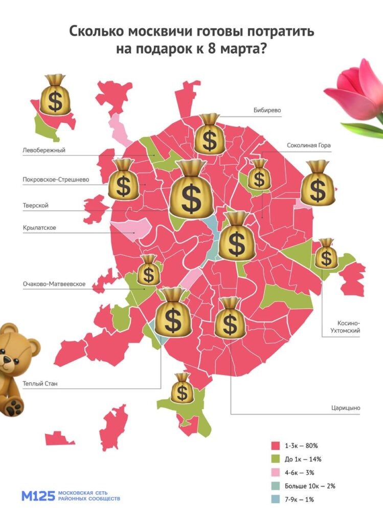Сеть районных сообществ М125 выяснила у москвичей оптимальную цену подарка к 8 Марта. Так, большинство жителей столицы (80%) говорят, что подарок должен стоить от 1 тыс. до 3 тыс. рублей. 14% опрошенных считают нужным тратить не больше 1 тыс. (чаще всего это жители Крюково, Левобережного и Дмитровского районов). От 4 тыс. до 6 тыс. рублей на подарок готовы потратить 3% (Восточное Измайлово, Гагаринский, Крылатское и Куркино). Самые щедрые подарки стоимостью 10 тыс. готовы дарить в Замоскворечье, Якиманке и Теплом Стане. А жители Тверского района считают, что можно уложиться в 7–9 тыс. рублей.