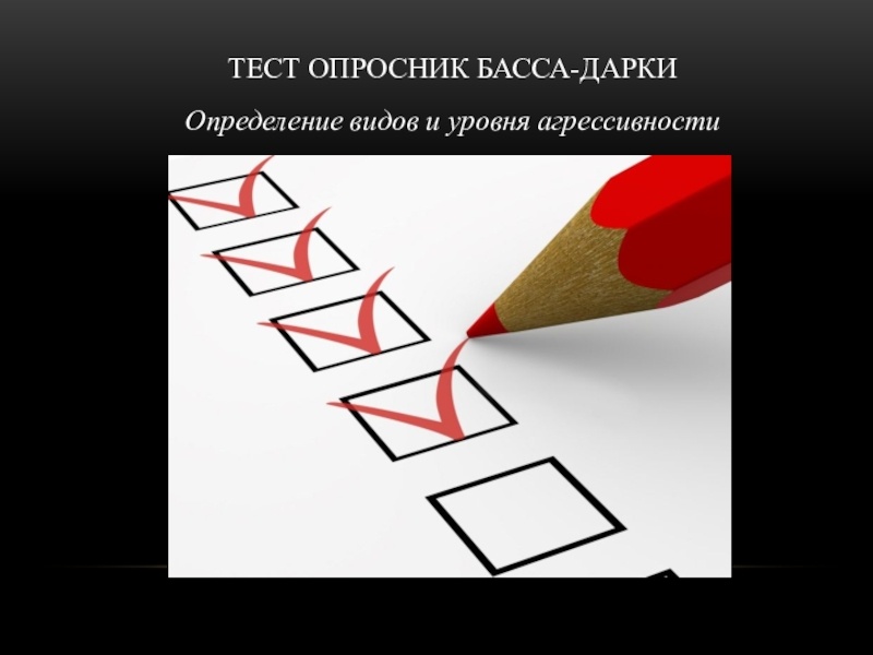 Опросник предназначен для диагностики агрессивных и враждебных реакций. Под агрессивностью понимается свойство личности, характеризующееся наличием деструктивных тенденций, в основном в области субъектно-объектных отношений. Враждебность понимается как реакция, развивающая негативные чувства и негативные оценки людей и событий. Создавая свой опросник, дифференцирующий проявления агрессии и враждебности, А. Басc и А. Дарки выделили следующие виды реакций: