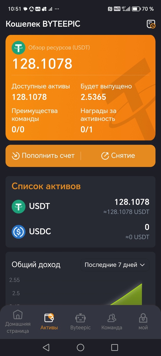 Ну хорошо, заработаю я к примеру 50 или 500, или 5000 USDT, а потом захочу вывести их для того, чтобы обменять на привычные деньги. Я могу все 5000 вывести с платформы? Как вы догадывается нет. Тут все зависит от грида, то есть уровня посвящения. Новички с первым гридом могут вывести с платформы максимум 500 USDT за раз. Что тоже впрочем неплохо. Напоминая, что в среднем каждый день прибавляется по 2% к первоначальной сумме. У меня было ещё неделю назад 111, а сейчас вот, 128 USDT. Мой телеграм t.me/amelinatatyana Моя ссылка на платфрму