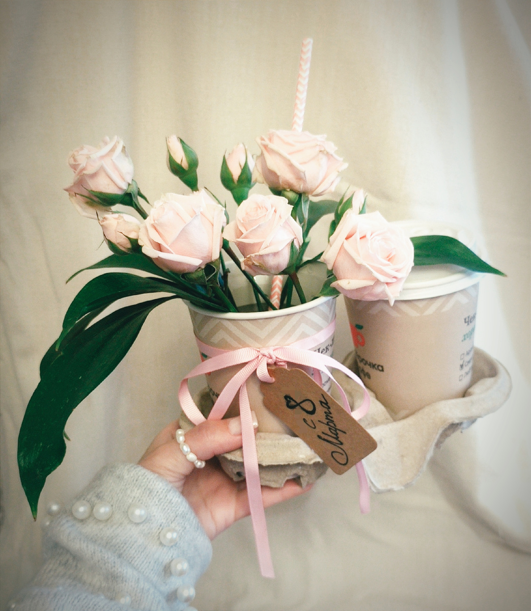 Здравствуйте! Решила в этом году упаковать подарок для дочки в кофейные стаканчики. В общем то я уже неоднократно использовала этот приём. В прошлом году, также на 8 марта, показывала эту идею. Получилось вот так - нежно. Ещё был такой, более яркий контрастный, вариант. Вспомнила, что как-то делала мини букет в вафельном рожке. Основания цветов тогда обложила мокрыми ватными дисками, завернула в плёнку и несколько пакетов. Букетик отлично весь день простоял в рожке, держателем послужил высокий бокал. Подружке понравился)) Много подобных примеров с рожкáми для мороженного и кофейными стаканчиками можно увидеть в Пинтерест. На этот раз кофе/чая/какао не будет, и цветов тоже не будет. На мини-открытку наткнулась случайно в Фикспрайс, и купила ленточки в похожих цветах, использующихся на открытке. Ленты обычно беру в Леонардо или Иголочке. Ещё, как вариант, вместо открытки можно использовать наклейки. Это послужит и украшением, и, плюс, таким способом возможно заклеить надписи