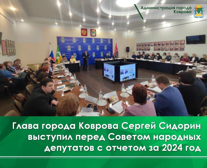 6 марта, на заседании Совета народных депутатов города Коврова, глава города Сергей Сидорин представил отчёт о деятельности администрации за 2024 год. фото администрации города Коврова В мероприятии приняли участие первый заместитель губернатора Владимирской области Александр Ремига, депутаты Законодательного Собрания Владимирской области Людмила Никитина и Инна Гаврилова, представители администрации города, силовых структур, общественных организаций, священнослужители и СМИ. В своём докладе Сергей Сидорин подчеркнул, что работа в 2024 году проходила в условиях санкционного давления, проведения Специальной военной операции, оказания помощи подшефным воинским частям, жителям новых регионов России и Курской области. Глава города представил детальный анализ социально-демографической ситуации, экономического потенциала, исполнения городского бюджета, состояния социальной инфраструктуры, а также сферы благоустройства и жилищно-коммунального хозяйства. Особое внимание было уделено ключевым з