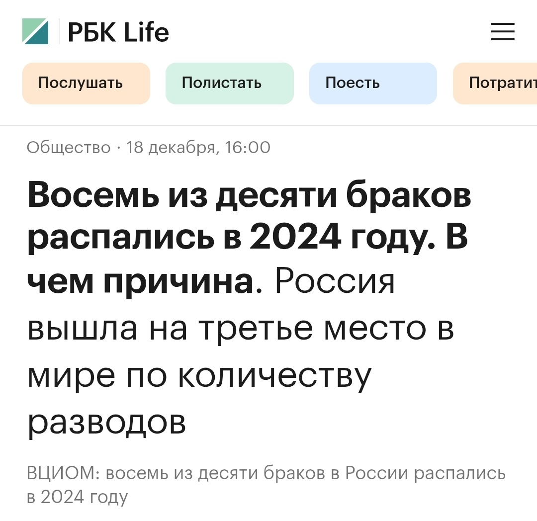 Согласно последним данным ВЦИОМ, в прошлом году на каждые 10 браков пришлось 8 разводов. Это рекорд. Шел 2024 год. Год семьи. Картина кажется ужасающей. ВЦИОМ говорит о снижении роли института официального брака. Как неоднократно подмечал священник Павел Островский, при официальной нацеленности российских властей на защиту традиционных ценностей такой огромный процент разводов говорит о серьезнейшем кризисе главного звена этих самых традиционных ценностей. Возникает вопрос: А не увидим ли мы превышение "смертности над рождаемостью" в отношении семей? Хочется верить, что нет. С другой стороны, следует отметить серьезные вызовы, с которыми Россия сталкивается в последние годы. Тяжелые времена - это испытание для семей. И понятно, почему именно сейчас в России так много разводов. Все мы помним мировой рост количества разводов в период пандемии. Более того, уже звучат голоса, что семьи разводятся, чтобы получать от государства льготы. Согласно переписи, в 2021 году в России насчитывалось