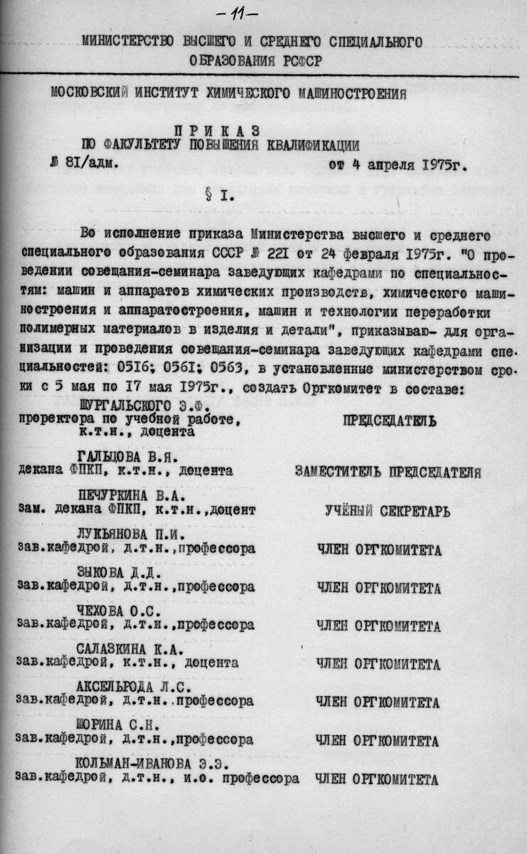 Во исполнение приказа Министерства высшего и среднего специального образования СССР No 221 от 24 февраля 1975г . "О проведении совещания -семинара заведующих кафедрами по специальностям : машин и аппаратов химических производств , химического машиностроения и аппаратостроения, машин и технологии переработки полимерных материалов в изделия и детали " , приказываю- для организации и проведения совещания -семинара заведующих кафедрами специальностей : 0516 ; 0561 ; 0563 , в установленные министерством сроки с 5 мая по 17 мая 1975г ., создать Оргкомитет в составе :