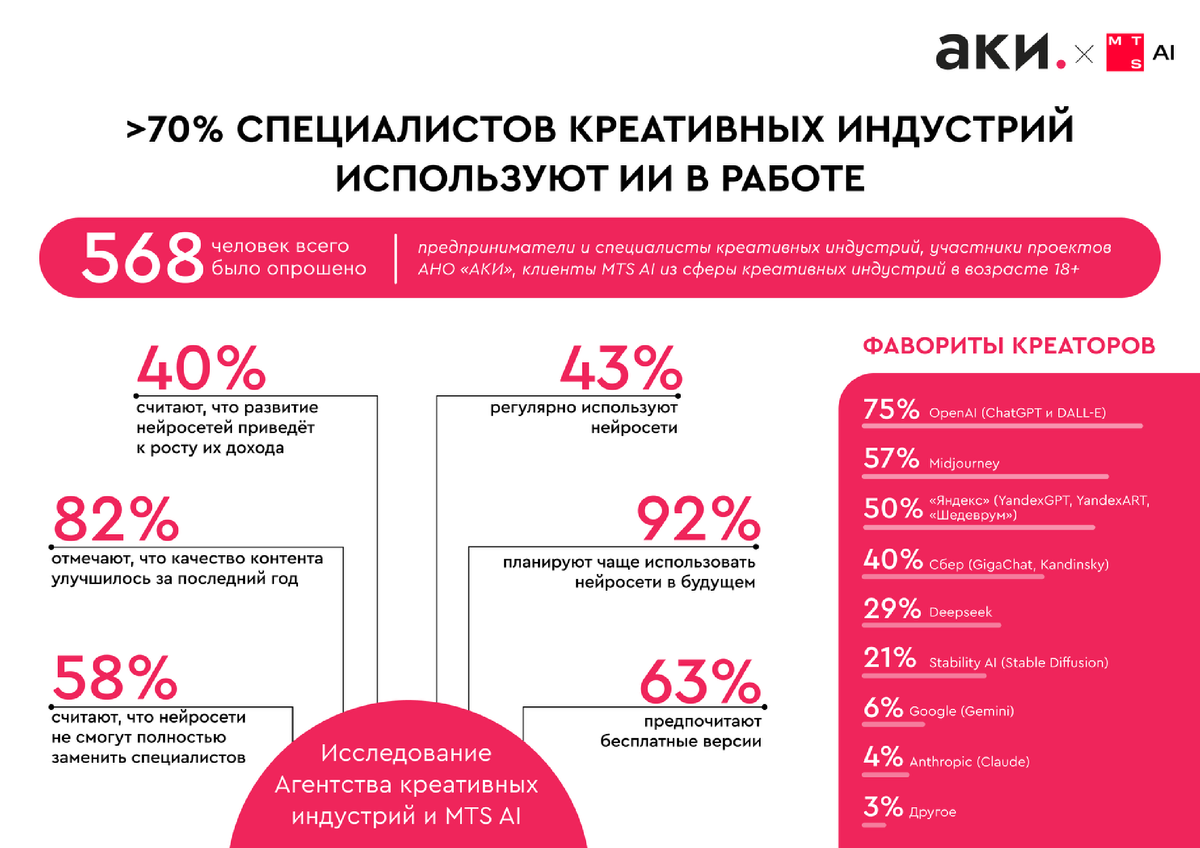 Агентство креативных индустрий Москвы и компания MTS AI провели исследование применения искусственного интеллекта в креативных индустриях. Только 8,1% специалистов полностью отказываются от использования нейросетей. Они объясняют это сомнениями в качестве создаваемого нейросетями контента и желанием работать с привычными инструментами. В то же время 68% креативщиков положительно относятся к новым технологиям. Среди активных пользователей ИИ этот показатель достигает 88%. Интересно, что лишь 3% опрошенных опасаются потери заработка из-за развития технологий. А 37% профессионалов допускают, что в будущем ИИ может частично заменить некоторые функции специалистов, но при этом останется вспомогательным инструментом. Гюльнара Агамова, руководитель АКИ, резюмирует: «Наше исследование показывает, что абсолютное большинство специалистов и предпринимателей креативных индустрий используют искусственный интеллект при решении рабочих задач. При этом ИИ остаётся инструментом, средством для оптимизац
