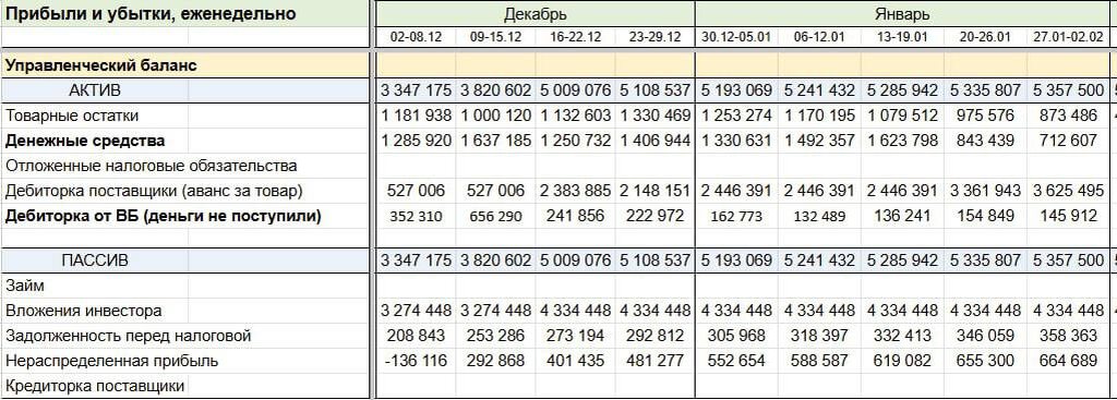 Мы думали, что классно считаем и этого достаточно. Но на быстром росте получилось, что по итогу у нас не все операции, а их у нас дохрена, по итогу попали в учет. Это выяснялось на сверке с партнерами раз в квартал, но объем стал критичен для такого срока ожидания сверки. Внедрили учет баланса и ситуация по проектам стала прозрачна, наши финики контролируют это каждую неделю. Баланс у большинства ВБшников максимально простой и его можно свести на коленке: АКТИВ Товарные остатки - все деньги в товаре на вашем складе или фф и на складе ВБ Денежные средства - все деньги на всех счетах и картах Отложенные налоговые обязательства - налоговая копилка (отложенные деньги на счете) Дебиторка поставщики (аванс за товар) - уплаченные деньги за товары в пути Дебиторка от ВБ и Озон (деньги не поступили) - это продажи, за которые отчитался маркетплейс и мы провели в отчет, но деньги еще не поступили ПАССИВ Займ - заемные средства вложенные в бизнес Вложения инвестора - ваши собственные деньги