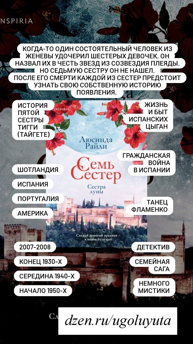 Прочитала пятую книгу про Семь сестер. Эта часть - про Испанию, испанских цыган и танец фламенко. Яркая история. В этой части упоминается танцовщица Аргентинита, но на сюжет она почти не влияет(в отличие от другие частей, где знаменитость была тесно связано с сюжетом). Еще здесь встречается человек из первой книги и есть продолжение истории одной из сестер. Внезапной "литературной кухни" не случилось. Испанские блюда я еще не готовила, но теперь есть идеи что приготовить.