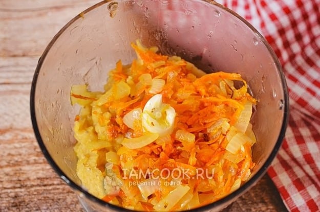 3. Обжариваем мелко нарезанный лук и тертую морковь на половине масла до золотистости.