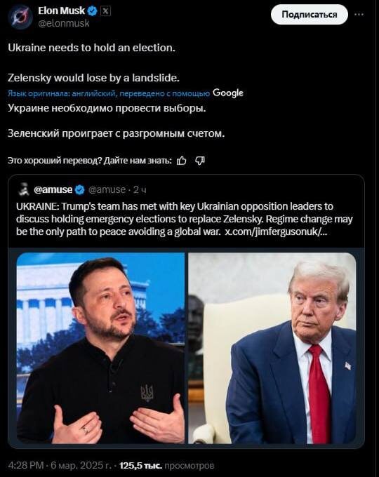 ❗️Украине необходимо провести выборы. Зеленский разгромно проиграет — Маск