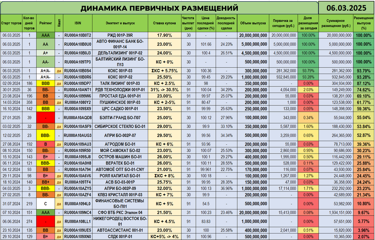 🙃 Получил под вечер очень горячий привет с Крайнего Севера - большое спасибо, уважаемый отправитель :) Красивые края можно встретить... А вот посты со статистикой пока будут продолжать выходить в несколько сокращённом режиме :( Но, тем не менее.... 🔸 Шесть героев первички разбились по парам: - БАЛТИЙСКИЙ ЛИЗИНГ БО-П13 и РЖД 001Р-39R были розданы несколькими сделками, в стакане не появились; - Пара КОКСов $RU000A10B0R6 $RU000A10B0S4 полностью разместиться не смогла, примерно 7% от каждого выпуска едут с нами на первичке дальше - ДЕЛЬТАЛИЗИНГ 001Р-02 $RU000A10B0J3 и АВТО ФИНАНС БАНК $RU000A10B0U0 001Р-14 разместились полностью и закрылись выше номинала. 🔸 Лидеры оборотов дня в своих весовых категориях: - До 1 миллиарда объемом: ЭКОНОМЛИЗИНГ 001Р-08 $RU000A10B081 . Аж 11 миллионов за день прошло в бумаге, весь объем которой всего 100. - Более 1 миллиарда рублей объемом: МАГНИТ БО-005Р-03 $RU000A10B0A2. 1,77 миллиарда за сессию. Очень заметный оборот, столько даже не в каждой ОФЗ н