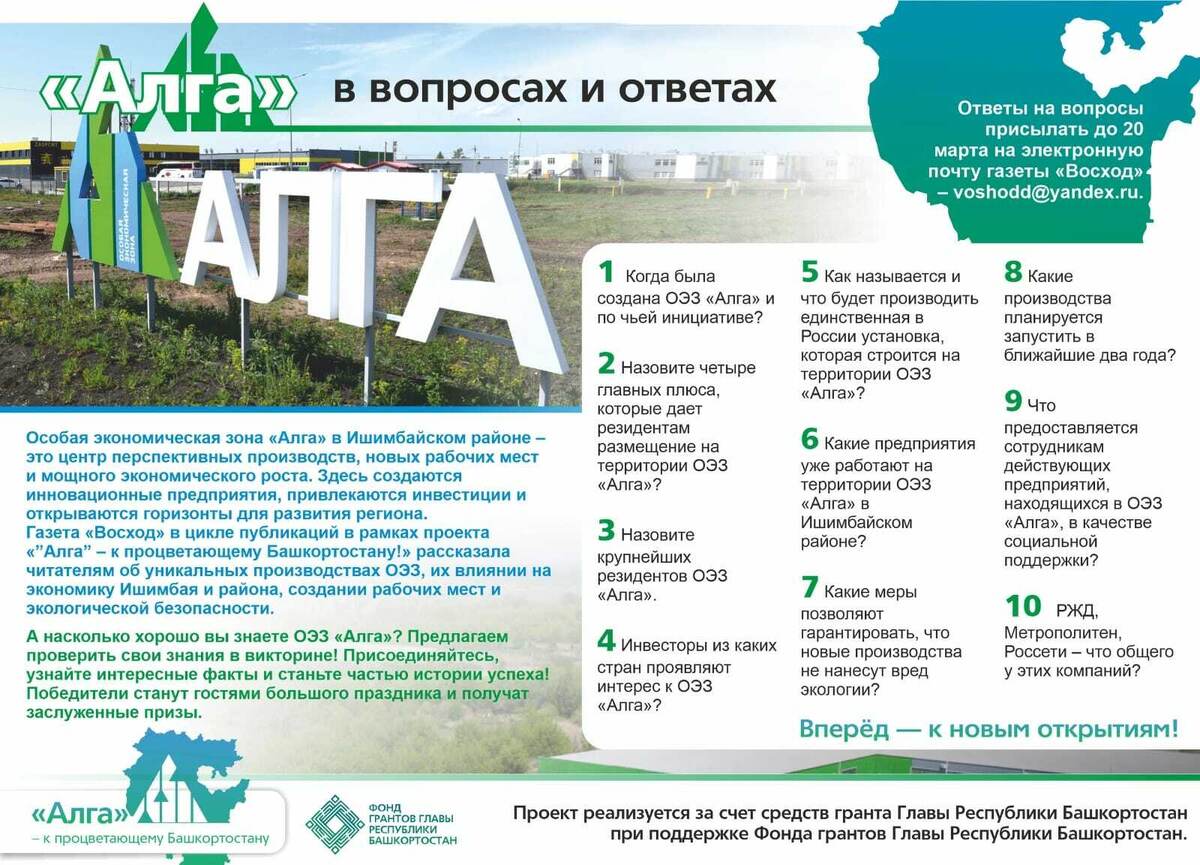Особая экономическая зона «Алга» в Ишимбайском районе – это центр перспективных производств, новых рабочих мест и мощного экономического роста. Здесь создаются инновационные предприятия, привлекаются инвестиции и открываются горизонты для развития региона. Газета «Восход» в цикле публикаций в рамках проекта «”Алга” – к процветающему Башкортостану!» рассказала читателям об уникальных производствах ОЭЗ, их влиянии на экономику Ишимбая и района, создании рабочих мест и экологической безопасности. А насколько хорошо вы знаете ОЭЗ «Алга»? Предлагаем проверить свои знания в викторине! Присоединяйтесь, узнайте интересные факты и станьте частью истории успеха! Победители станут гостями большого праздника и получат заслуженные призы. Ответы на вопросы присылать до 20 марта на электронную почту газеты «Восход» – voshodd@yandex.ru. Вперёд — к новым открытиям! 1. Когда была создана ОЭЗ «Алга» и по чьей инициативе?