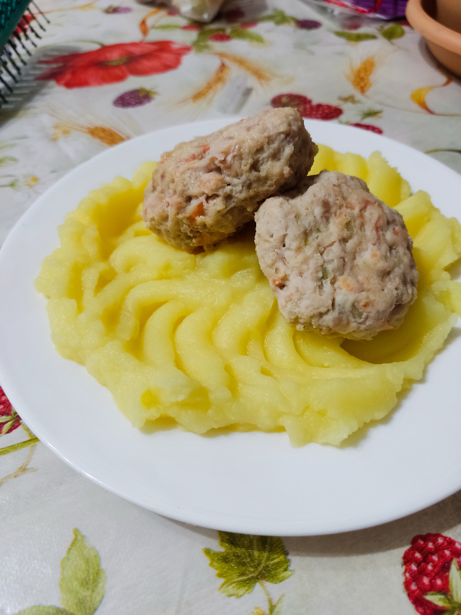В наше время детки такие слабенькие, подвержены болезням . Мы не исключение. Очередные проблемы с желудком привели к строгой диете. Вот сегодня у нас на обед пюре с куриными паровыми котлетками . Вот ловите рецепт. Для этого нам понадобится : Фарш куриный - 1 кг. Яйцо- 2 шт. Морковь -1 шт. Лук репчатый - 1 шт. Картофель -1 кг. Молоко - 300 мл. Соль по вкусу. Фарш смешиваем с яйцом , морковью и луком. Делаем заготовку для котлет. Посолить обязательно . Картофель солим, варим, делаем пюре с добавлением молочка обязательно . На сковороде разогреваем воду до кипения и делаем котлетки. Так как у нас нет пароварки, то мы делаем на воде. Результат я считаю не хуже. Готовим примерно 20 минут. Все готово! Приятного аппетита мои дорогие ! Не болейте 🙏