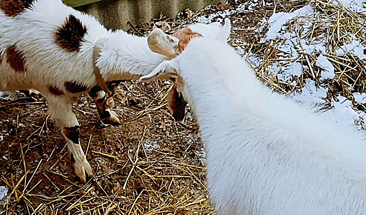 Как ведет себя та, которая с дня на день должна стать мамой? По мнению научных книг, всем положено успокоиться и проявлять максимальную осторожность. Именно такое мнение я многократно читала о козах в различной научной литературе. Мол, животные будут искать спокойное место, уединяться, чтобы их никто не ударил даже случайно… Но в этом году козы мне попались именно те, которые не читали умных книжек и не знали, что им можно, а нельзя было делать перед рождением козлят. Чем дико испугали меня. Я за неделю до рождения козлят даже шуметь около коз боялась и ходила на цыпочках, а они взяли и устроили настоящий бойцовский клуб будущих мам. Досталось даже моего сыну. Прямо у меня на глазах буйная коза оторвала кусок от куртки и съела, а потом попыталась закусить шарфиком. И это при том, что все витамины у коз всегда потребляются в срок и в полном объеме. Но этот год у них особенно веселый. Привычного затишья перед родами не наблюдалось совсем. Пишут, что козочки за пару дней до рождения ма