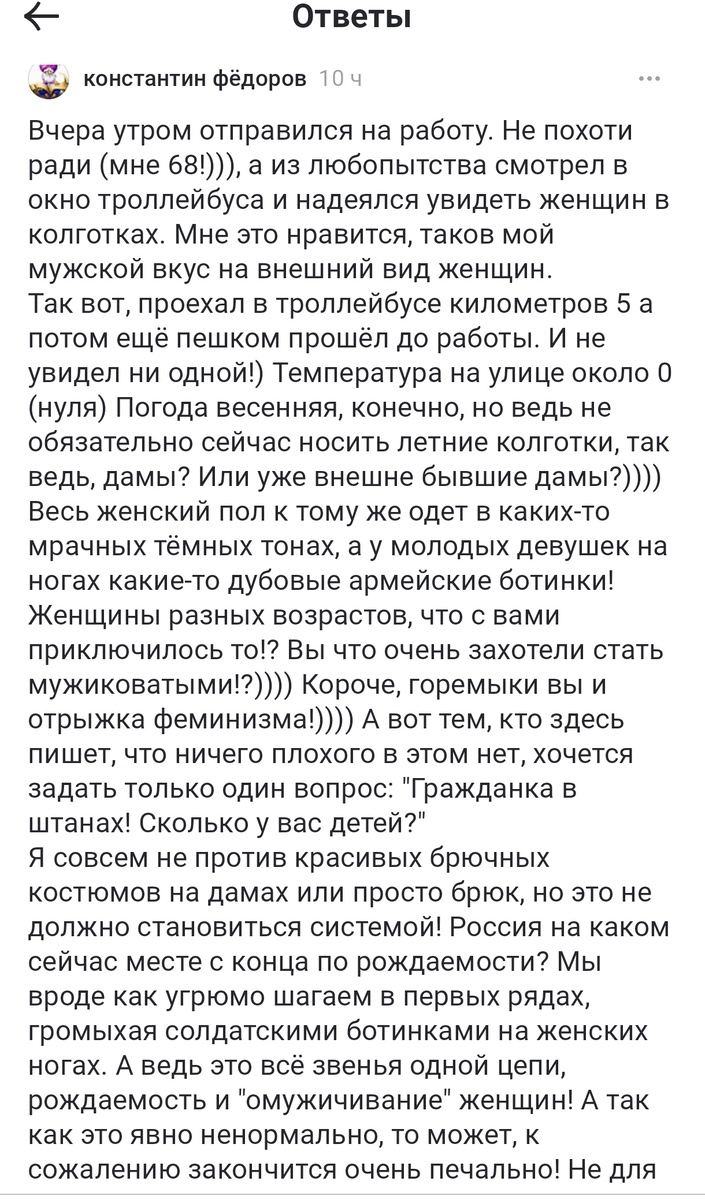Иначе это уже проявленный феминизм - отказ от неудобной одежды и обуви. Да и на рождаемости плохо сказывается грубая обувь и брюки у женщин всех возрастов.