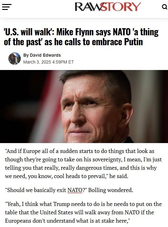 Генерал-лейтенант Майк Флинн, пользующийся популярностью среди ультраправых сторонников Трампа, выступил с резкой критикой НАТО и призвал США выйти из альянса. В интервью Real America’s Voice Флинн осудил воинственную риторику европейских лидеров и предостерег от провокаций в адрес России. По мнению Флинна, любые действия, воспринимаемые Москвой как угроза ее суверенитету, приведут к серьезным последствиям для Европы. “Мы живем в очень опасные времена, и наша голова должна оставаться холодной”, — заявил генерал. Он также высказался за сближение с Владимиром Путиным, полагая, что это отвечает интересам США. Отвечая на прямой вопрос о выходе из НАТО, Флинн заявил: “Да, я считаю, что Трампу стоит рассмотреть такой вариант, если европейцы так и не осознают, ЧТО стоит на кону”. Это заявление, вероятно, отражает взгляды части трампистов, считающих НАТО устаревшей организацией. Слова Флинна, близкого в прошлом к Трампу, могут свидетельствовать о потенциальном изменении внешнеполитического кур