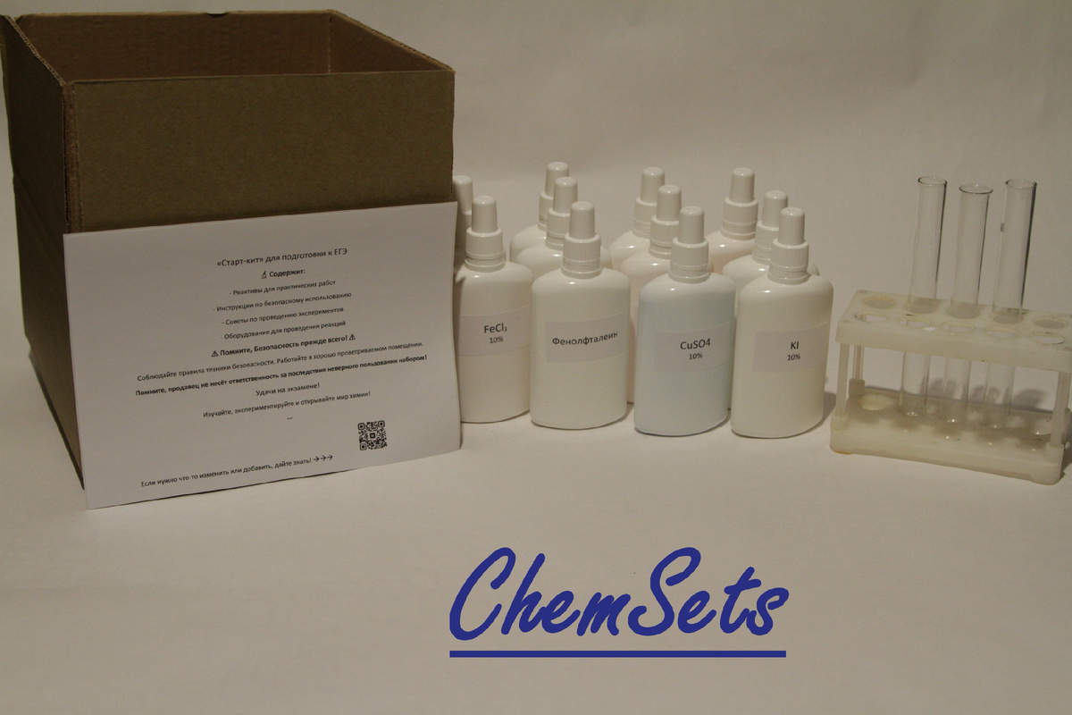 Что же это такое - набор "СтартКит"? При сдаче ЕГЭ по химии необходимо знать множество свойств самых разных элементов. Команда "Химсет" предусмотрела это и создаёт наборы для изучения отдельных разделов химии. Химия меди, хрома, железа, марганца и многое другое! В этих наборах собраны абсолютно все важные реакции для ЕГЭ по указанным элементам, вы сможете изучить всё и даже немного больше, благодаря нашим статьям. Но что же делать тем, кто ещё не определился с тем, что ему интересно, или просто не знает с чего начать? Специально для таких химиков мы разработали данный набор. Он содержит самые важные и красочные реакции из ЕГЭ по химии по всем элементам! Поведение перманганата калия в разных средах, многогранные окислительные свойства железа и завораживающие осадки соединений меди - всё это собрано в наборе "СтартКит".