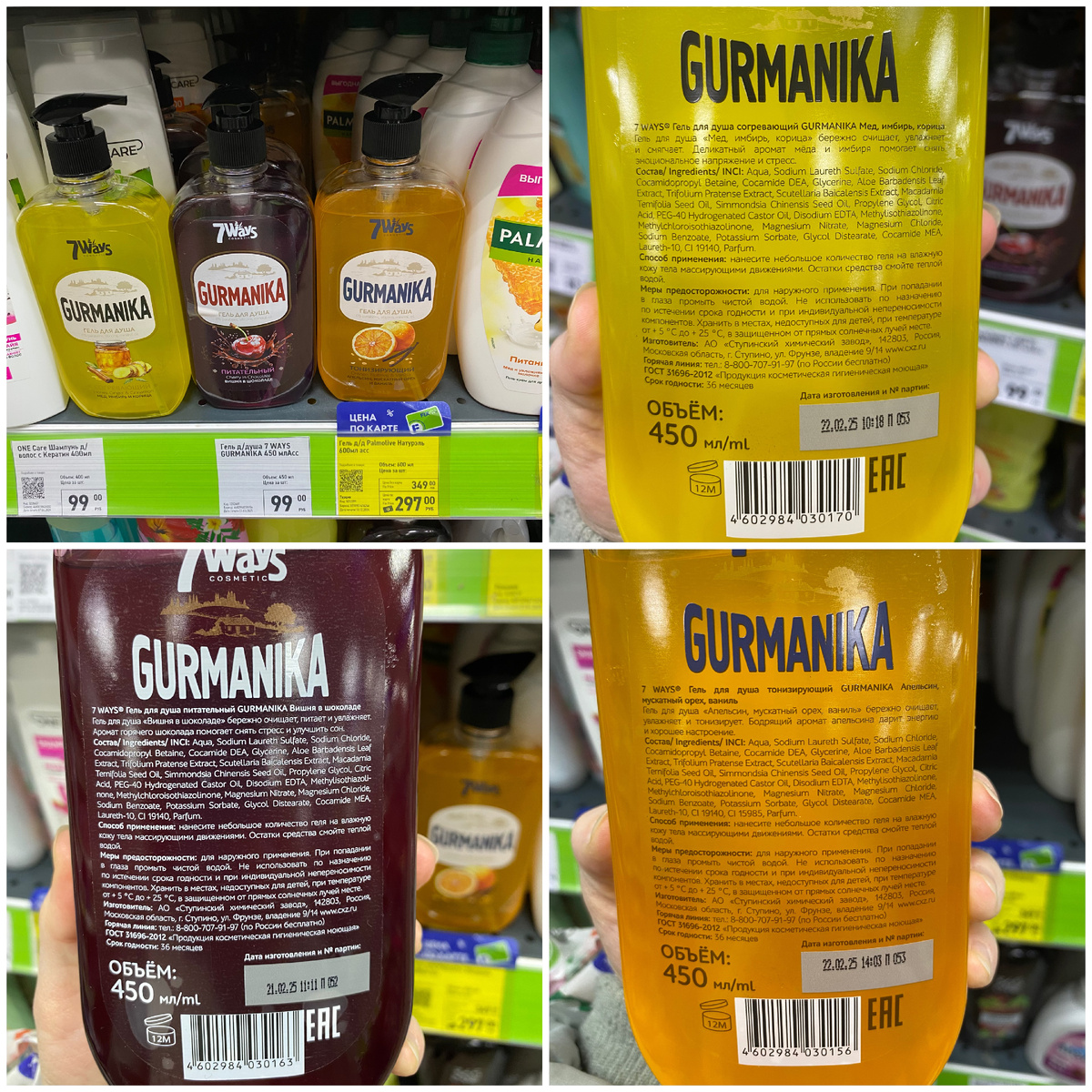 Всем привет. Меня зовут Наталья. Я очень рада видеть вас на своём канале. Сегодня мы с вами прогуляемся по магазину Фикс Прайс, который находится по адресу: город Йошкар-Ола, улица Красноармейская, дом 84а. На полочках уже начали появляться пасхальные товары. Так что устраивайтесь поудобнее. Желаю всем приятного времяпровождения. Гель для душа 7 WAYS GURMANIKA стоимостью 99 рублей. Его объём 450 мл. Страна изготовления Россия. В магазине 3 варианта: согревающий гель "Мёд, имбирь, корица"; питательный гель "Вишня в шоколаде"; тонизирующий гель "Апельсин, мускатный орех, ваниль". Гель для душа Solzao стоимостью 279 рублей. Цена по карте лояльности составляет 252 рубля. Объём геля 400 мл. Страна изготовления Россия. В магазине 3 варианта: 1. Гель-уход с экстрактом персика, витамином С и флавоноидами. Он повышает эластичность кожи, уменьшает воспаления, стимулирует синтез галогена. 2. Гель-уход с маслом бразильского ореха, селеном, цинком и жирными кислотами. Он глубоко питает кожу, восста