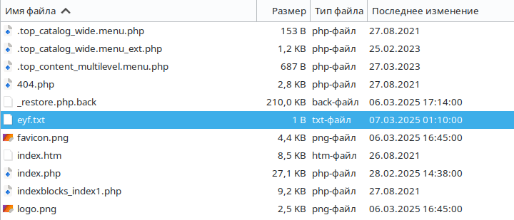 Да, есть вероятность, что это полностью вина разработчиков Битрикс. К слову сказать ребята подготовились и выпустили патч, который исправляет ошибку разработчиков. И инструкцию выпустили какие файлы заражены и что с этим делать. Молодцы, хоть здесь не опозорились. И казалось бы на этом история закончилась. Но не тут то было.... Не проблема, забираем патч и запускаем на сайте. И после применения всех рекомендаций, идем включаем антивирус от Битрикса. Но! как выясняется это не помогает. Видите ли Антивирус не видит в папках uploads файлы index.php. Не странно ли? Ведь в них кроме jpeg вообще ничего не должно больше находиться. Как я нашла? Да очень просто. В корне сайта постоянно создается файл eyf.txt И о чудо: Интересно, откуда в каталогах uploads взялись index.php