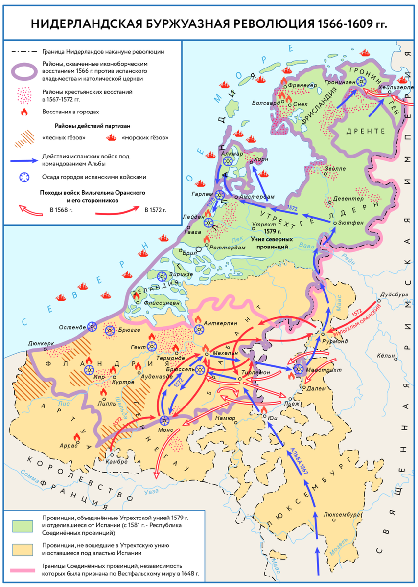 Нидерландская буржуазная революция (нидерл. Tachtigjarige Oorlog -- «Восьмидесятилетняя война») -- успешная революция 17 провинций в борьбе за независимость от Испанской Империи. В результате революции была признана независимость 7 Соединённых Провинций. Области, ныне известные как Бельгия и Люксембург (те из 17 провинций, которые остались под правлением Габсбургов), получили название Южных Нидерландов. Первым лидером революции был Вильгельм Оранский. Нидерландская революция стала одним из первых успешных расколов в Европе и привела к появлению первых современных европейских республик. Изначально Испании удавалось сдерживать всякого рода ополчения. Однако в 1572 году повстанцы захватили Брилле, и вспыхнуло восстание. Северные провинции приобрели независимость, сначала де факто и в 1648 де - юре.