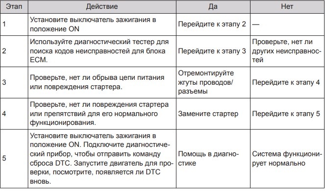 Описание кода неисправности: повреждение стартера или обрыв цепи питания стартера.