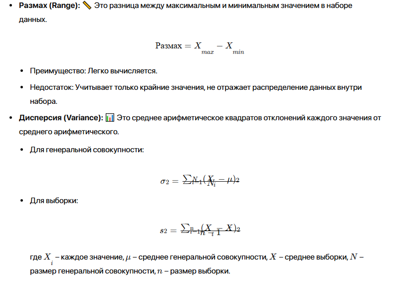 Показатели вариации характеризуют степень изменчивости или разброса значений в наборе данных. Вот основные показатели вариации: