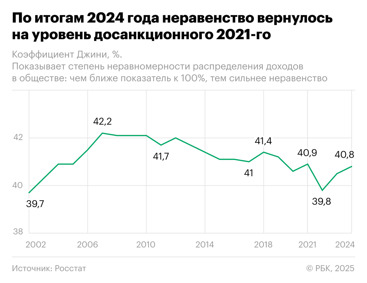 Оба показателя неравенства 2024 года примерно соответствуют уровню «досанкционного» 2021 года — тогда коэффициент Джини составлял 0,409, а коэффициент фондов — 15,2.