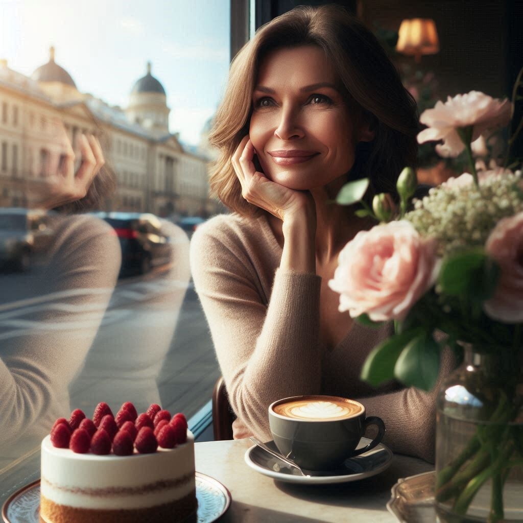За соседним столиком сидела элегантная женщина в строгом костюме. Она заметила мой взгляд и приветливо кивнула. Между нами возник молчаливый диалог — мы обе были здесь одни, и обе, казалось, наслаждались этим.