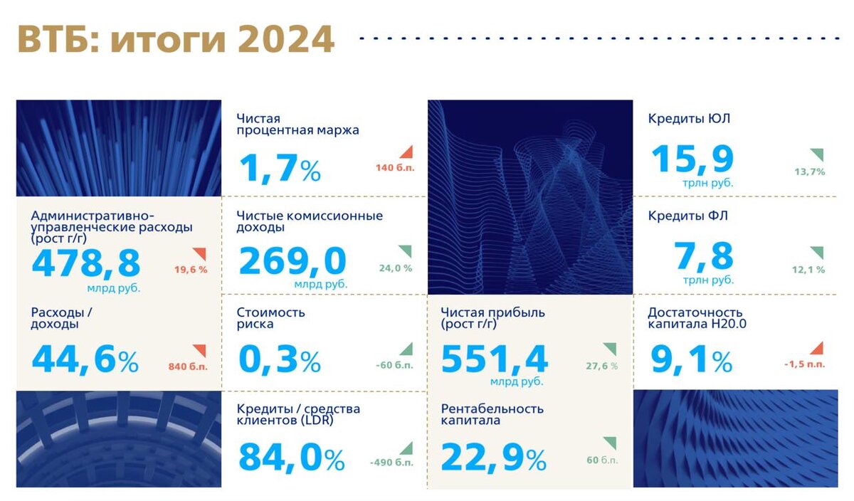 Несмотря на негативные ожидания аналитиков, банковский сектор в кризисные 2022–2024 годы продолжил развиваться. Причина кроется в сохранении высоких уровней кредитования, особенно корпоративного. В конце 2024 года темпы роста кредитования начали замедляться, что окажет давление на доходы банков. Сегодня разбираемся со всем этим на примере отчета ВТБ за полный 2024 год. Итак, чистые процентные доходы «синего» банка за отчетный период снизились на 36% до 487,2 млрд рублей. Такая динамика обусловлена существенным ростом процентных расходов в два раза - до 3,6 трлн рублей. При этом чистая процентная маржа снизилась на 140 б.п. до 1,7%. ВТБ прогнозирует ключевую ставку ЦБ на уровне 21% на весь 2025 год. Я бы не стал разбрасываться такими прогнозами, но соглашусь, что ставка останется высокой, что продолжит в текущем году давить на маржу. Как и прочие банки, ВТБ снизил в 2024 году отчисления на создание резерва под кредитные убытки с 175,6 млрд рублей до 23,9 ярдов. Однако даже это не смогло