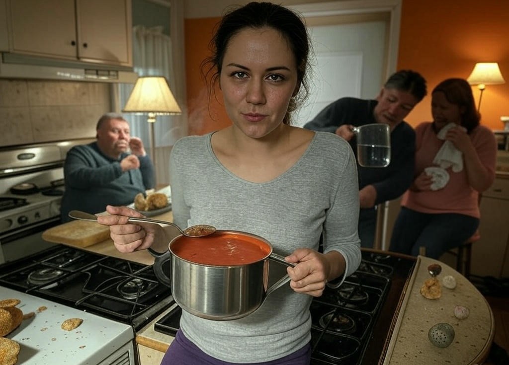 Я налила суп — щедро, по тарелкам. Но перед этим — фокус: в кастрюлю я добавила ложку перца чили, щепотку соли сверх нормы, уксус для запаха. Суп стал адским — пах вкусно, но жег, как факел. Тётя хлебнула, закашлялась: «Маша, что это?» Димка схватил воду, Светка вытерла слёзы: «Ты решила нас отравить?»