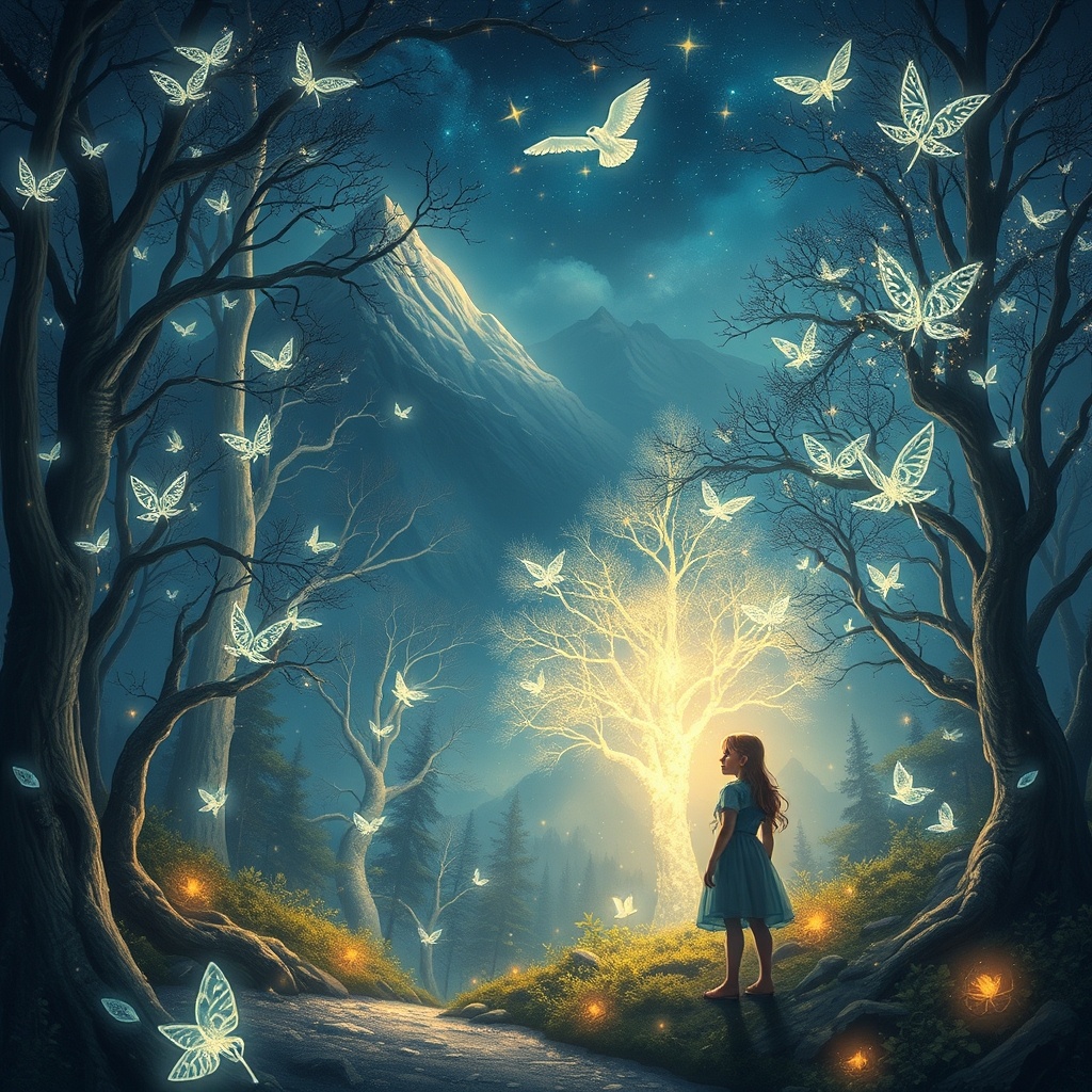 Лира поблагодарила фею и направилась дальше, полная надежды и решимости. Вскоре она оказалась у подножия высокой горы, на вершине которой стояло древнее дерево. Его ветви тянулись к небу, а корни уходили вглубь земли. Лира знала, что это место хранит последние тайны Лунного Леса.