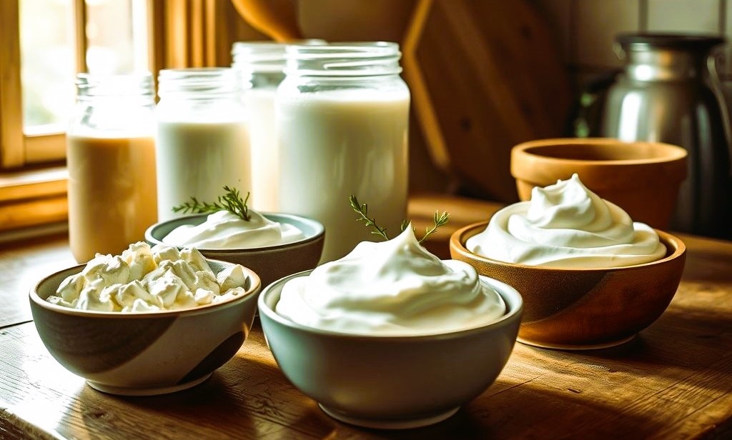 Ряженка готовится путём ферментации топлёного молока, что придаёт ей особый вкус и полезные свойства. Она богата кальцием и полезными бактериями, которые поддерживают здоровье кишечника. - Творог