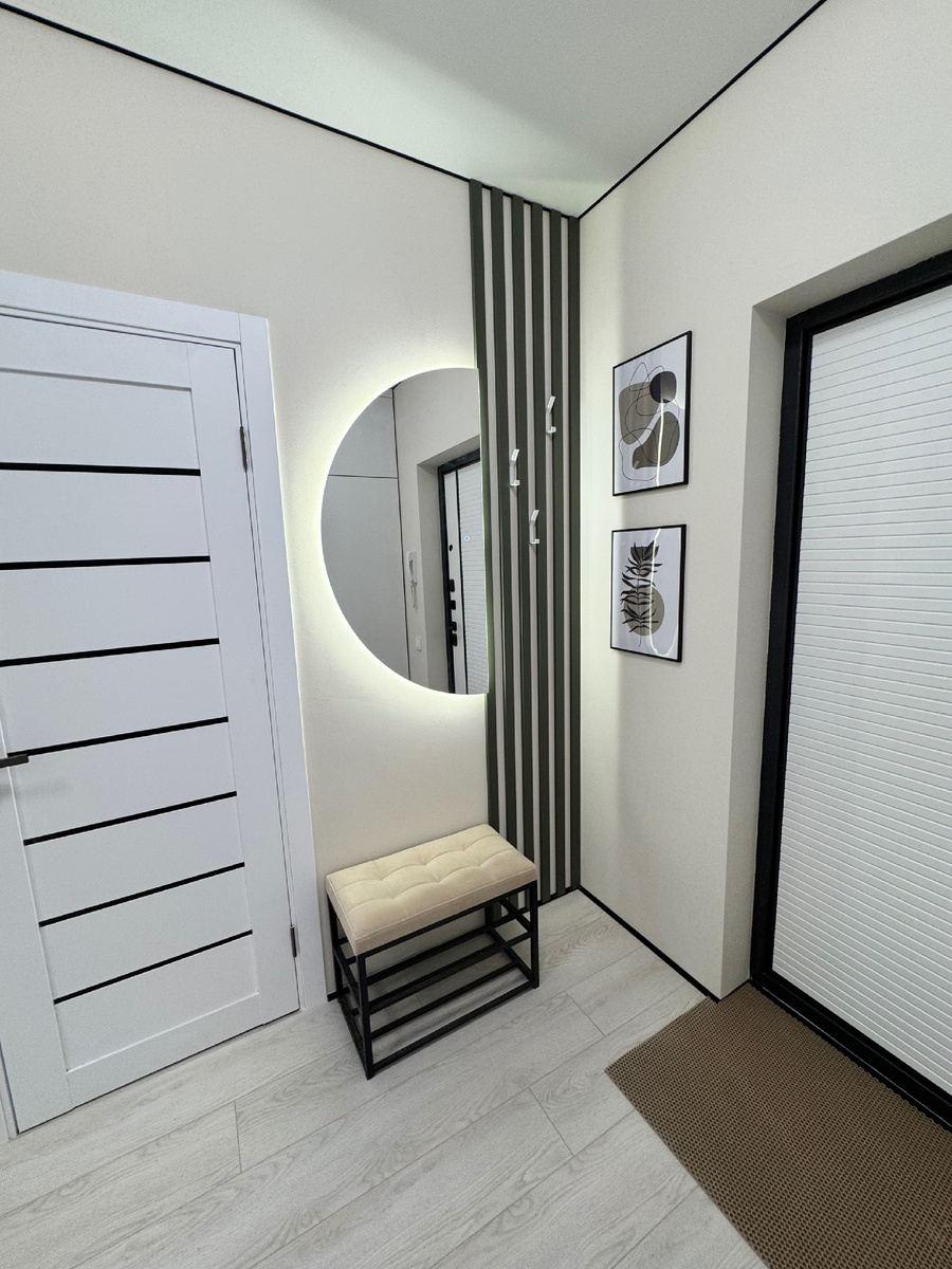 Продолжаем рассказывать о проекте, который мы завершили совсем недавно. Это однокомнатная квартира 40 кв м в самом центре Ростова-на-Дону ЖК Сердце Ростова 2 ♥️ . Сегодня расскажу как мы оформили входную группу. На изображении представлен современный интерьер прихожей. - **Стены**: Одна из стен украшена вертикальными полосами зелёного цвета, в то время как остальные стены выполнены в светлых тонах. - **Зеркало**: Основной фокус падает на круглое зеркало с LED-подсветкой, которое расположено на полосатой стене. - **Мебель**: На переднем плане видна скамейка с мягкой обивкой светлого цвета, которая идеально сочетается с общим стилем. - **Декор**: На стенах размещены несколько картин в рамках, добавляющих уют и стиль в пространство. - **Двери**: Слева расположена белая дверь с горизонтальными полосами, что также соответствует современному минималистичному дизайну. Всё это создает впечатление светлого и просторного пространства, которое удобно для входа в дом. Поэтому наш коридор - это