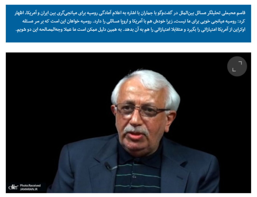 ▪️ Бывший генеральный директор по делам Ближнего Востока в МИД Ирана Касем Мохебали заявил, что Москва не может быть хорошим посредником для иранцев в ядерной сделке. Она-де просто добивается от Вашингтона уступок по украинскому досье за счёт Ирана.