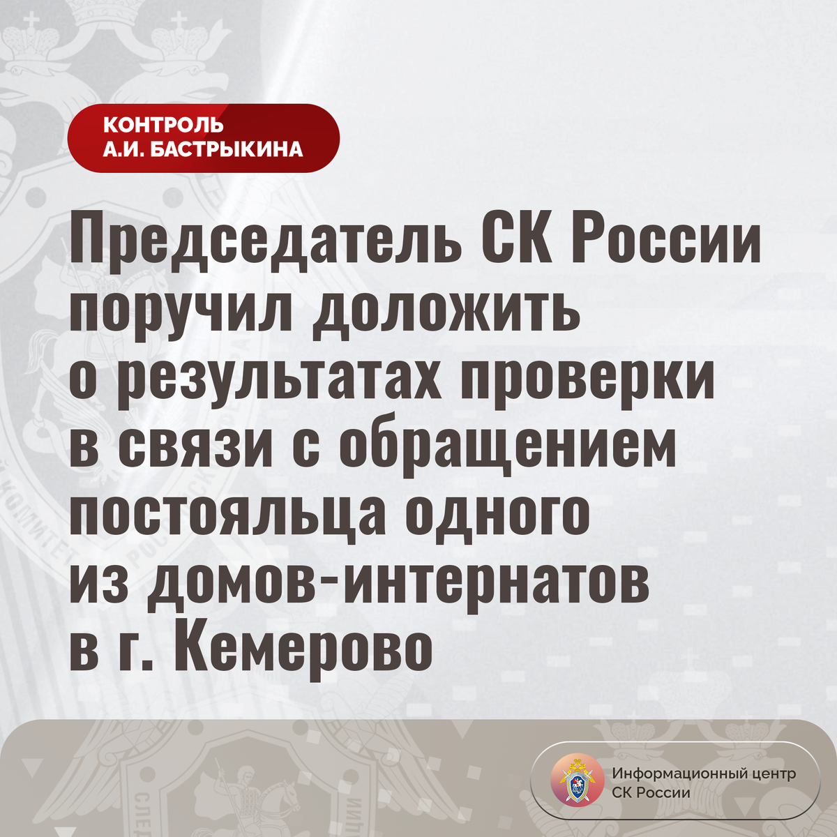 Председатель СК России поручил доложить о результатах проверки в связи с обращением постояльца одного из домов-интернатов в г. Кемерово