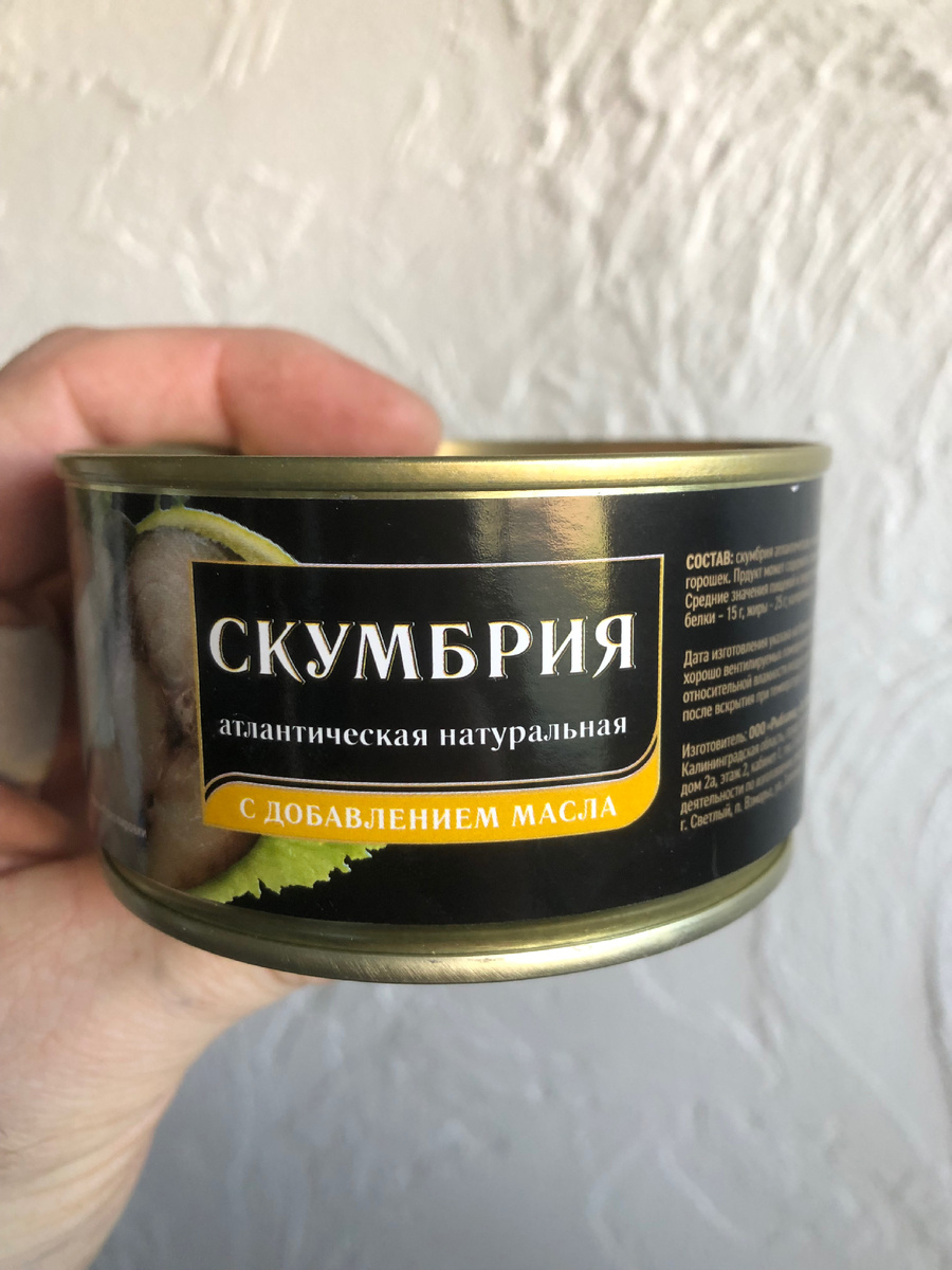 Атлантическая с добавлением масла! Вчера был в магазине и купил вот такую консерву на тест-драйв) На самом деле я не очень люблю консервированнуюе скумбрию. Мне она больше нравится, когда она сыровяленая или копченая. Когда я ходил в море на рыболовных судах, мы часто готовили скумбрию. Но готовили мы только два блюда. Первое: мы готовили брюшки скумбрии. Обжаривали лук в масле и затем обжаривали в нем брюшки скумбрии. Это очень вкусно. Второе: мы готовили рулеты из скумбрии с чесноком и приправами. Это просто бомба. Замораживали и кушали потом как строганину. Кстати, завод, «За Родину», который производит эти консервы, находится в посёлке Взморье. Это 20 минут езды от Калининграда. И представляете, он работает аж с 1947 года. Купить эти консервы можно в любом магазине. И вроде как по всей сети «5Пятёрочка» Около территории завода находится их собственный магазин, в котором представлен ну просто неимоверный ассортимент рыбной продукции. 185 грамм вкусного продукта. Кстати,