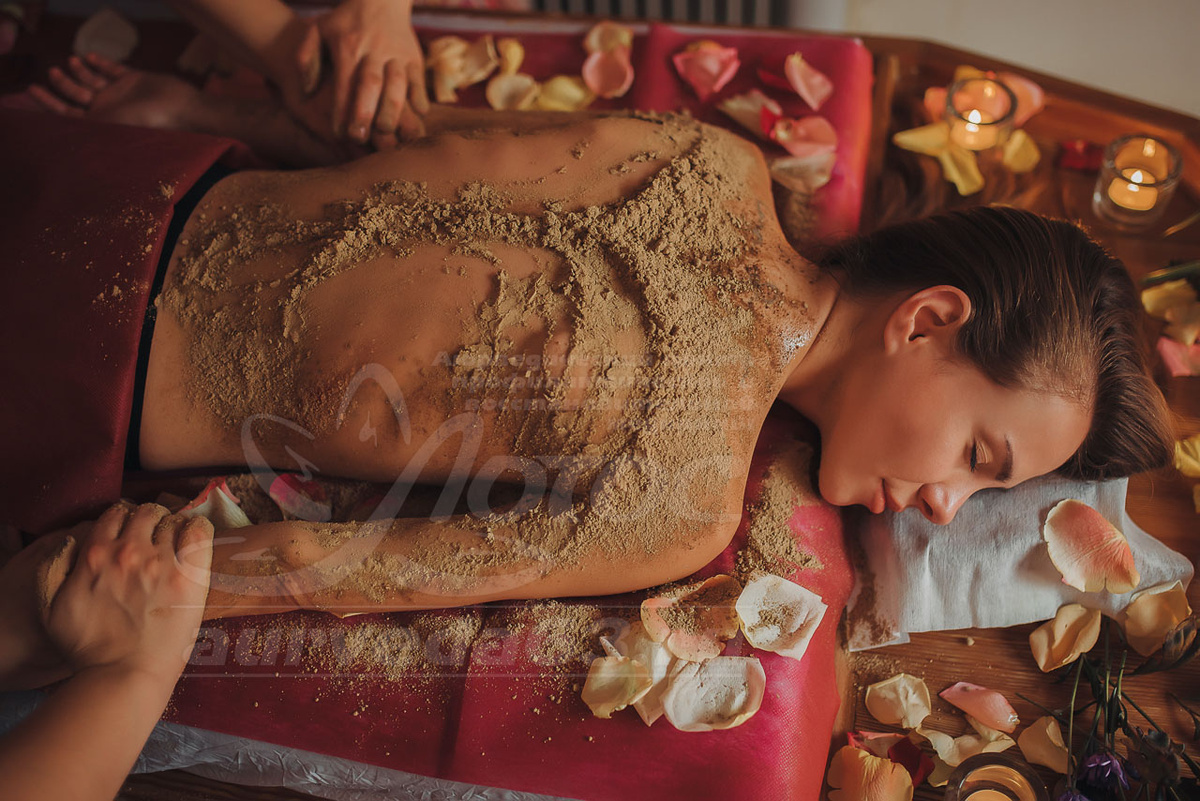 Удвартан — сухой массаж от Аюрведы. Одна из немногих процедур, для выполнения которой используются не масла, а порошок, полученный в результате смешивания самых разных трав, специй и добавок — специй, травяных порошков, нута, гороха и др. Нередко такие составы обогащают эфирными маслами. По сути — это массаж со скрабом, который улучшает кровообращение и восстанавливает обмен веществ, повышает тургор кожи, ее эластичность и упругость, минимизирует проявления целлюлита и варикоза, снимает усталость и напряжение. Полезные вещества, всасываясь в кожу, улучшают обмен веществ в мышцах и жировой ткани, принося легкость, свежесть и чистоту не только телу, но и мыслям. Массаж может проводить как один мастер, так и двое. При этом они энергично втирают порошок в кожу. Приятная музыка и благовония — неизменная составляющая Удвартана. Проводится после Абхйанги. Очень хорошо сочетать эту процедуру с паровой кедровой бочкой и теплым душем. Длительность процедуры: до 90 мин Оптимальный курс: от 3 до 2