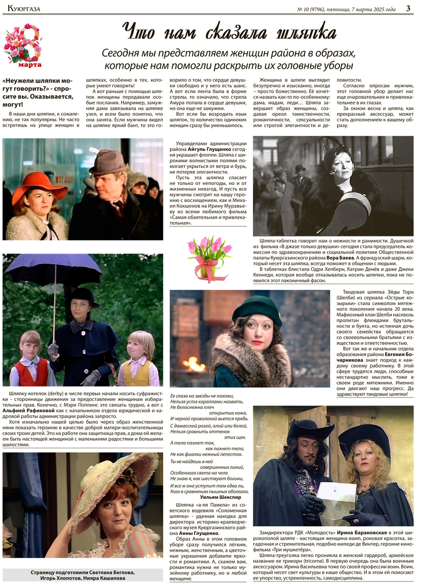 Головные уборы помогли раскрыть внутренний мир куюргазинских дам Что нам сказала шляпка Сегодня мы представляем женщин района в образах, которые нам помогли раскрыть их головные уборы «Неужели шляпки могут говорить?» - спросите вы. Оказывается, могут! В наши дни шляпки, к сожалению, не так популярны. Не часто встретишь на улице женщин в шляпках, особенно в тех, которые умеют говорить! А вот раньше с помощью шляпок женщины передавали особые послания. Например, замужняя дама завязывала на шляпке узел, и всем было понятно, что она занята. Если мужчина видел на шляпке яркий бант, то это говорило о том, что сердце девушки свободно и у него есть шанс. А вот если лента была в форме стрелы, то означало, что стрела Амура попала в сердце девушки, но она еще не замужем. Вот если бы возродить язык шляпок, то количество одиноких женщин сразу бы уменьшилось. Женщина в шляпе выглядит безупречно и изысканно, иногда – просто божественно. Её хочется назвать как-то по-особенному: дама, мадам, леди… Шляпа