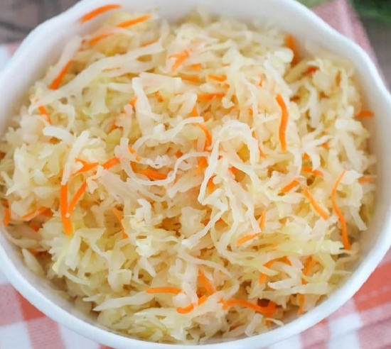 Ингредиенты: - кочан капусты - 1 крупная морковка - 1 ст. л. соли (лучше крупной) - щепотка перца горошком - несколько лавровых листочков. Приготовление: На разделочной доске шинкуем соломкой кочан капусты, который по размеру примерно равен футбольному мячу. Затем натираем крупно морковь. После этого капусту равномерно распределяем по столу, посыпаем солью и тщательно разминаем руками. Далее начинаем выкладывать ингредиенты слоями в пятилитровую кастрюлю: немного моркови, немного перца и лаврового листа, затем слой капусты. Повторяем последовательность слоев, пока вся капуста не будет уложена. Сверху накрываем широкой тарелкой и устанавливаем груз (например, наполненную водой бутылку). Спустя сутки убираем груз и тарелку, после чего протыкаем капусту ножом в нескольких местах. Затем снова накрываем тарелкой и ставим под пресс. Через следующие сутки процедуру повторяем, а вечером перекладываем готовую капусту в банки и отправляем в холодильник. Уже на третий день капусту можно пробовать