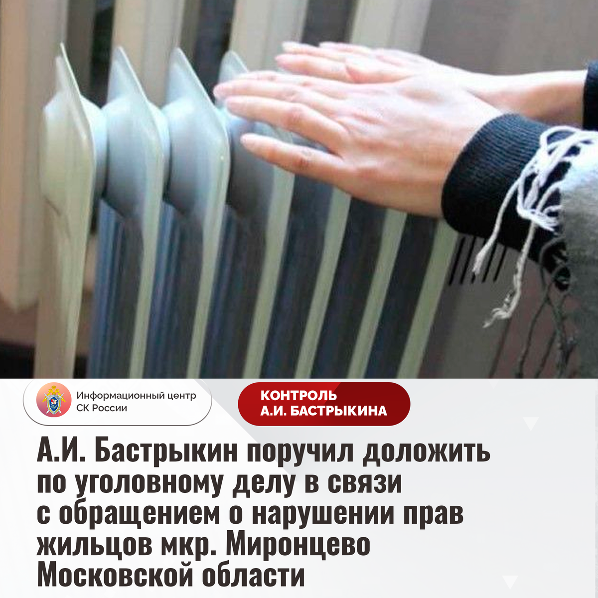 А.И. Бастрыкин поручил доложить по уголовному делу в связи с обращением о нарушении прав жильцов мкр. Миронцево Московской области В Информационный центр СК России обратился житель Московской области по вопросу нарушения прав жителей микрорайона Миронцево городского округа Солнечногорск. Несмотря на установку в мае прошлого года нового оборудования в местной котельной, с декабря в жилые помещения граждан, а также объекты социальной инфраструктуры отопление и горячее водоснабжение подаются с перебоями. При этом коммунальный ресурс поступает с примесями ржавчины, ввиду чего непригоден для питья и бытовых нужд. Из-за постоянной сырости и промерзания стен в квартирах граждан появилась плесень, температурный режим ниже установленной нормы. Многочисленные обращения в администрацию и управляющую компанию результатов не принесли. В ГСУ СК России по Московской области по поступившему обращению возбуждено уголовное дело. Председатель Следственного комитета Российской Федерации Александр Иванович