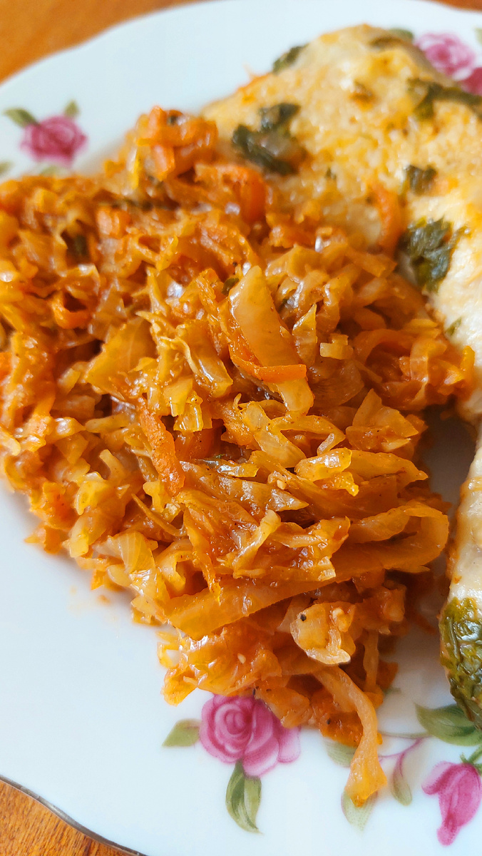 Всем привет! Уж который день думаю - надо про капусту написать. И всё забываю) Но не в этот раз. Прямо сейчас и напишу! Плюсы этого блюда - * вкусно * готовить просто * экономно * как самостоятельное блюдо, как начинка в пирожки и вареники, как подгарнир ( идеально сочетается с картофельным пюре) * постное. Во всех заведениях общепита, где я её готовила - неизменно пользовалась популярностью. Очень любит такую капусту мой брат и Михалваныч. Хороша, как в холодном, так и в горячем виде. Недостатки - * надо нашинковать капусту) * на первом этапе приготовления - характерный запах) * нужна посуда с высоким бортом, объем у капусты большой. Как готовить - * Свежую белокачанную капусту нашинковать тонко и красиво) * морковь натереть на крупную тёрке * лук нарезать средним кубиком * В жаровне с высоким бортом или в широком сотейнике, разогреть растительное масло. Добавить капусту и дать немного прожарится. Буквально 5 минут. Закрыть крышку на пару минут, чтобы капуста осела. Затем крышку от