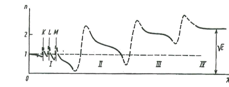 Преломление в диэлектрическую среду сопровождается обратимой трансформацией и перераспределением энергии кванта между ST- и M-признаками. В этом наглядно проявляется участие смежных континуальных планов. Скрытая материя подпространств обычно воспринимается «невидимкой» в феноменах дальнодействия, нелокальности и «спутанности». В ТК явление преломления объясняется «перекрытием» полевой материи разных планов. В этом обыденном, на первый взгляд, явлении существует интересная загадка. Если сравнивать дисперсионные кривые различных материалов, то налицо закономерность: показатель преломления диэлектриков в оптическом диапазоне неизменно попадает в область n=1...2. Ниже показана дисперсионная кривая из классического учебника В.В. Лебедева («Экспериментальная оптика», изд. МГУ, 2005г.). Оптический диапазон на графике обозначен цифрой II. В радиодиапазоне IV материалы частично утрачивают диэлектрические свойства, и кванты взаимодействуют с электронами. В коротковолновом диапазоне I сильное влияние оказывает поглощение, ионизация и аномальная дисперсия.