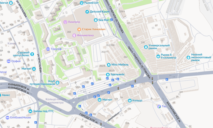 На карте через дорогу от него мы с вами видим огромный рынок, который состоит из нескольких. На карте видно «Универсальный рынок», «Нижний мелкооптовый рынок».