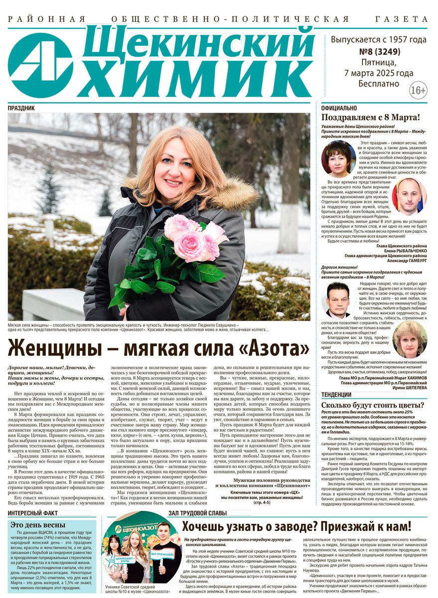 И «Щекинский химик» спешит к читателям с праздничными яркими темами! Вся жизнь района и компании – в одной газете на 8 полосах! Сегодня – в выпуске: – Миллион алых роз! Дамы, это ваш день! – Женский коллектив «Азота»: цех углекислоты! – Вселенная любви Людмилы Савушкиной – Вандалы из парка получат по заслугам! – Масленица: отметили с огоньком! – Отопительную кампанию нормализуют – Какие дороги отремонтируют в районе в этом году? – Актуальные вакансии в компании «Щекиноазот». Газета распространяется бесплатно! Получайте «ЩХ» в точках выкладки (адреса – ниже). Есть новости? Редакция – на связи: +7(48751)9-28-98, konik@azot.net