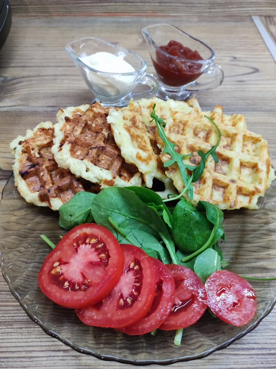 ДРАНИКИ И КУРИНЫЕ КОТЛЕТЫ В ВАФЕЛЬНИЦЕ ДЛЯ БЕЛЬГИЙСКИХ ВАФЕЛЬ. "ДРАНИКИ" 1. Почистить картофель. 2. Натереть на крупной терке. Посолить. 3. Почистить и натереть на мелкой терке чеснок. 4. Хорошо отжать картофель от ненужного сока. 5. Добавить яйца, сметану, соль, чеснок, специи по вкусу и предпочтению, немного муки. 6. Всё хорошо перемешать. По желанию можно поперчить. 7. Нагреть вафельницу и сбрызнуть растительным маслом. 8. Выложить картофельную массу на каждую половинку. 9. Закрыть крышкой и выпекать примерно по 5 минут, пока драники не зарумянятся. "КОТЛЕТЫ ИЗ КУРИЦЫ" 10. Нарезаем куриное филе на небольшие кусочки 11. Отправляем мясо в блендер. Добавляем к нему лук, чеснок, специи, яйцо, немного муки. 12. Всё хорошо перемешиваем. 13. Дальше всё как и с драниками. На разогретую вафельницу смазанную растительным маслом выкладываем мясную смесь. Закрыть крышкой и выпекать до золотистой корочки. 14. Соединяем драники и котлетки на одном блюде. Добавляем зелень и овощи. Подаем с ра