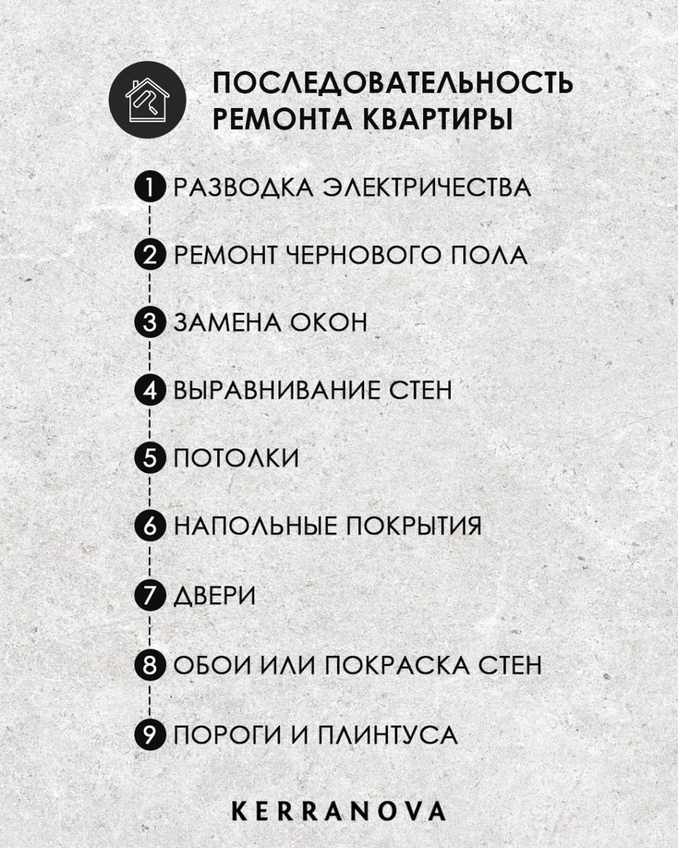 Ремонт без дизайнера-профессионала — это столько вопросов. И самый первый из них — с чего начать? Новое пространство квартиры требует план ремонта. Наши специалисты по ремонту, с которыми работает наш шоурум, составили удобный чек-лист, где по пунктам разделили все этапы стартового ремонта до мебели. Сохраняйте! Специально для 6 этапа с напольными покрытиями бренд KERRANOVA представляет дизайнерский керамогранит высокого качества. Вот две полезные статьи для выбора плитки в интерьер: Чтобы быть в курсе всех наших новостей, подпишитесь на официальные каналы KERRANOVA: Telegram: t.me/TM_Kerranova ВКонтакте: vk.com/tmkerranova Официальный сайт KERRANOVA: kerranova.ru