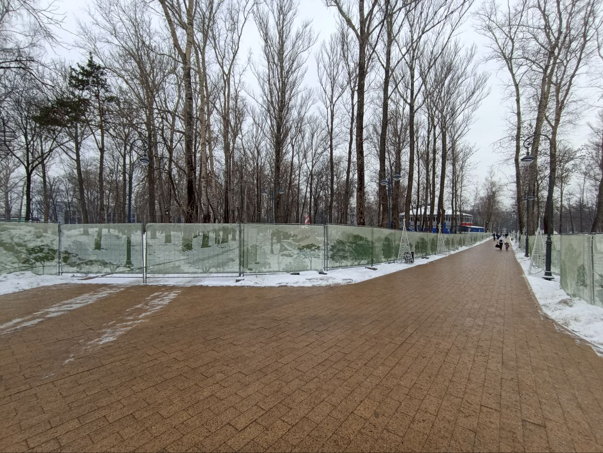 Нижегородский парк имени 1 мая интересен тем, что он находится недалеко от Московского вокзала. То есть можно приехать в город и сразу прогуляться туда, если у вас есть время. Несмотря на шумные улицы рядом, в самом парке тихо спокойно даже с детскими аттракционами. Рядом находится стадион Локомотив, но сейчас на нем больших матчей не играет как 10-15 лет назад. В июне прошлого года парк закрыли на реконструкцию, обещали открыть до нового года, но, как обычно, не успели и зимой открыли, как писали, половину парка. Я сходил прогулялся и увидел, как выглядит эта половина открытого парка. Вообще никакой подробной информации, что открылось и где можно погулять, я так и не нашел, поэтому решил с семьей отправиться в парк, чтобы посмотреть всё вживую. Сначала проехал мимо на трамвае и увидел, что главный вход в парк со стороны сквера Валерия Чкалова закрыт, поэтому понял, что надо будет сразу направляться ко входу со стороны бывшего ДК им.Ленина. Такая табличка висела у главного входа в парк