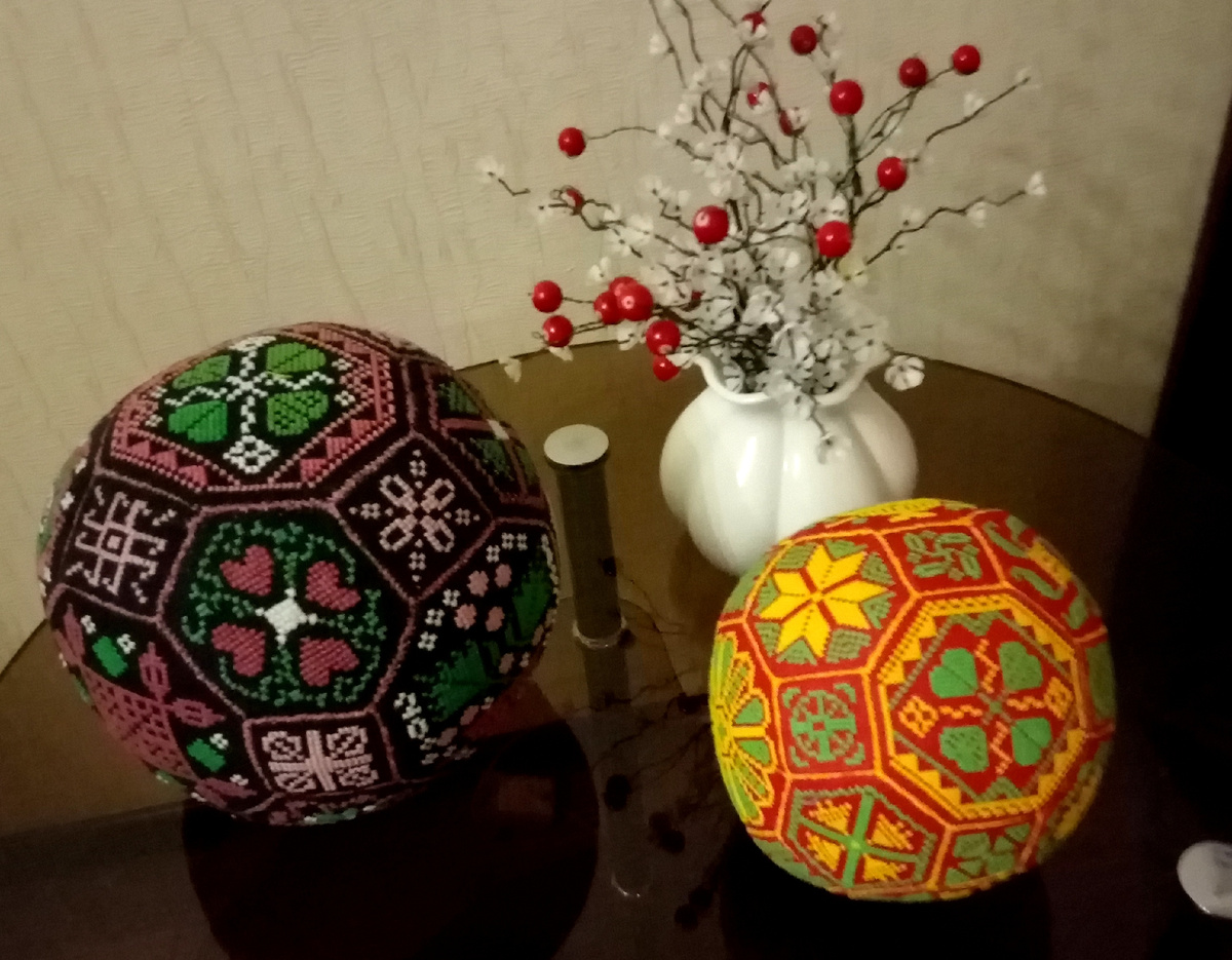 Всем привет! Как я и планировала мой первый финиш случился в виде квакерболла. Напоминаю что это уже второй мой мячик. О первом мяче можно почитать тут: Для вышивки деталей использовала одну и ту же схему. Результат оказался совершенно неожиданным. Новый квакерболл получился в два раза меньше предыдущего. Красная канва имеет 14 каунта, но какой же каунт был у чёрной канвы, если из неё получился такой гигант? Для изготовления мяча надо было вышить 26 деталей: 6 - восьмиугольников. 8-шестиугольников. 12-кадрратов. Затем я приступила к сшиванию деталей. Прежде чем приступить к работе, я проклеила готовые детали дублерином. Это необязательная процедура, но мне кажется, что так удобнее. Вышились детали легко, но не очень быстро. А вот сшивать детали оказалось трудно,в отличии от первого раза. Чем мельче канва, тем труднее делать всё аккуратно. В общей сложности я шила мячик около тридцати часов. За это время я сломала две иголки и натёрла мозоли на пальцах, а правая рука до сих пор