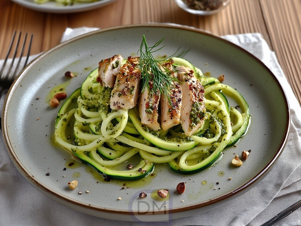 Лапша из кабачков с песто и курицей — это настоящий кулинарный шедевр, который сочетает в себе легкость летнего блюда с богатством итальянской кухни. Кабачки, превращенные в тонкую и нежную «лапшу» с помощью спирализатора, становятся основой этого блюда. Они идеально дополняются сочными полосками куриного филе, которые были предварительно обжарены до золотистого цвета на гриле или в сковороде. Соус песто, приготовленный из свежих трав и орехов, добавляет блюду яркий и насыщенный вкус. Его кремовая текстура и ароматные ноты идеально сочетаются с хрустящими кабачками и нежной курицей. Оливковое масло, используемое в приготовлении, усиливает общий вкус блюда, придавая ему тонкую глубину и изысканность. Каждый компонент блюда тщательно подобран, чтобы создать гармоничный баланс вкусов и текстур, что делает его по-настоящему незабываемым. Когда вы подаете это блюдо, оно выглядит как настоящий кулинарный шедевр. Яркие зеленые цвета кабачков и песто, сочетающиеся с золотистыми полосками куриц