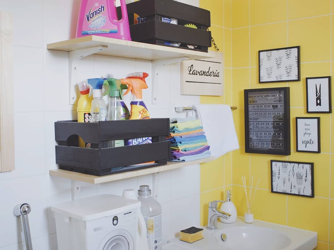 🔸 Полки Ну и немного декора — я распечатала памятку с символами стирки и подходящие принты, а из мебельного щита, цепочки и саморезов-крючков сделала табличку 🛠️. Кстати, Lavandería означает «прачечная» — от латинского «мыть», а когда-то цветы лаванды добавляли в воду для ароматизации 🌸🛁 ⭐ Слив в полу — предусмотрен в котельной как аварийный, но очень помогает.