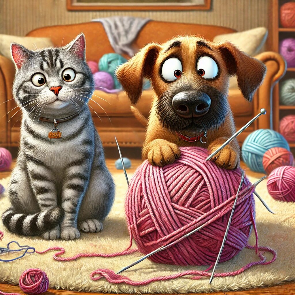Но когда кот решил снова поиграть… клубка НЕ БЫЛО! — Куда он делся?! — Барсик начал обыск. Он заглянул под диван — пусто. Проверил за шкафом — тишина. Обнюхал миску Шарика… Подождите-ка! Барсик заметил странную ниточку, тянущуюся в сторону пса. — Шарик! Ты не видел мой клубок? — подозрительно спросил кот. Шарик нервно сглотнул. — Я… эээ… просто хотел немного поиграть… Барсик сердито фыркнул: — Отдавай! Но Шарик уже так запутался в пряже, что превратился в пушистый шерстяной ком! Барсик долго пытался его размотать, но каждый раз только хуже запутывал! В итоге они вдвоём завалились на пол и громко рассмеялись. С тех пор Барсик и Шарик играли только вместе, чтобы больше не было «шерстяных преступлений».